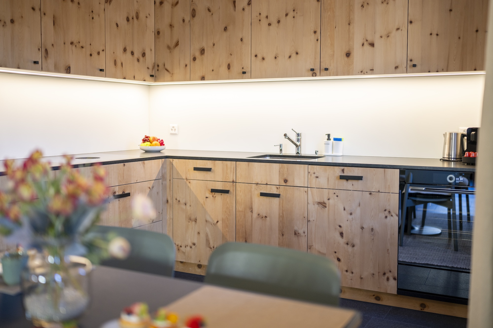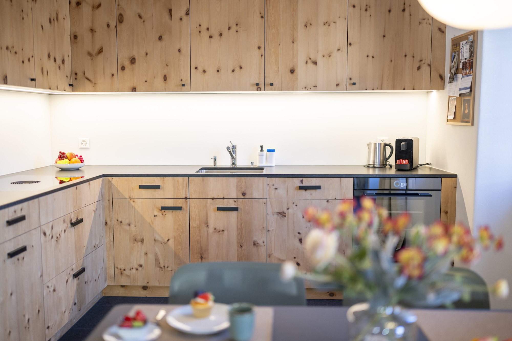 Die offene Küche ist funktional und gut ausgestattet für eine unkomplizierte Selbstverpflegung: Kühlschrank mit Gefrierfach, Backofen, Induktionskochfeld, Geschirrspülmaschine, Geschirr und Kochutensilien sowie Kaffeemaschine und Wasserkocher.