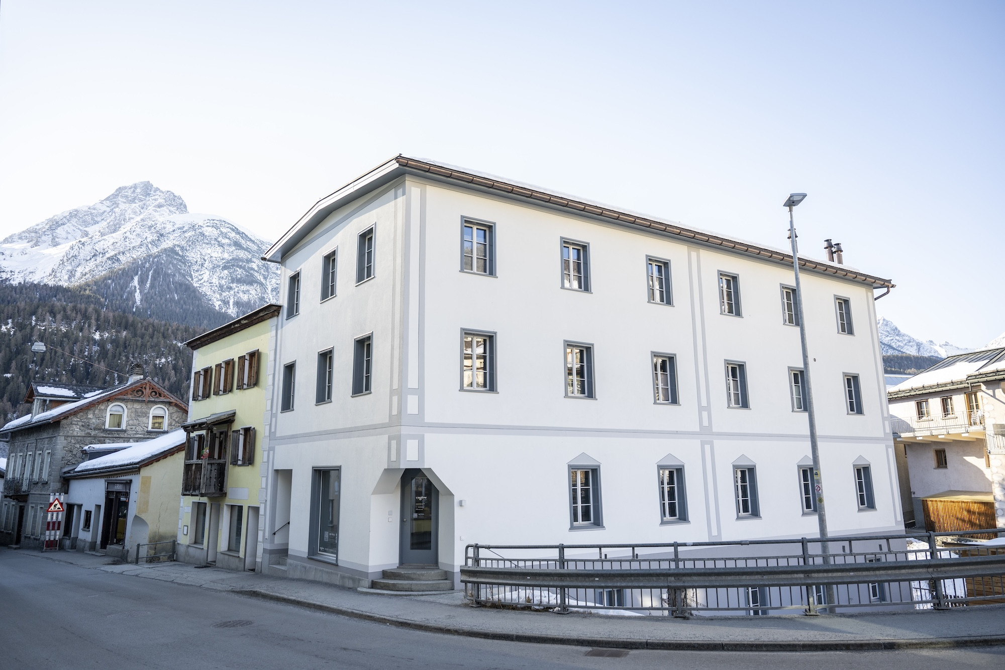 Die Wohnung befindet sich im Parterre eines dreistöckigen Hauses nur wenige Schritte von der alten Holzbrücke unterhalb der Kirche in Scuol Sot direkt an der kopfsteingepflasterten Dorfstrasse.